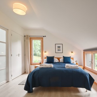 On the ground floor you will find two ensuite double bedrooms, the living area, with plenty of places to sit, a tv and DVD player (DVDs available) and lots of books. In the living area there is a wood pellet boiler which, along with a heat recovery system heats the whole of the house. There is a well equipped kitchen (including dishwasher, microwave and induction hob.). The open plan living area and kitchen open on to the expansive terrace with its far reaching views to the south and west. There is also a laundry room with a washing machine, (cleaning products provided) sink and ‘guest’ lavatory.
